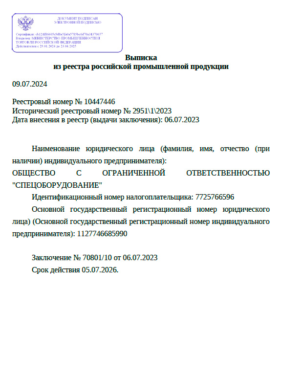 Оборудование соответствует ТУ и ГОСТ