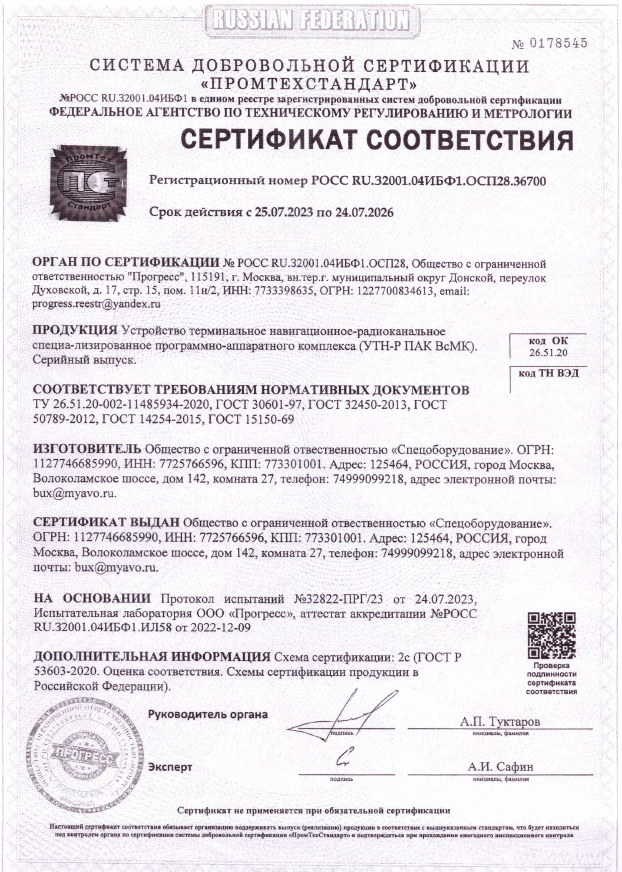 Оборудование Системы АВО, производимое ООО «Спецоборудование», имеет сертификацию соответствия отраслевым стандартам Российской Федерации и Евразийского Экономического Союза.